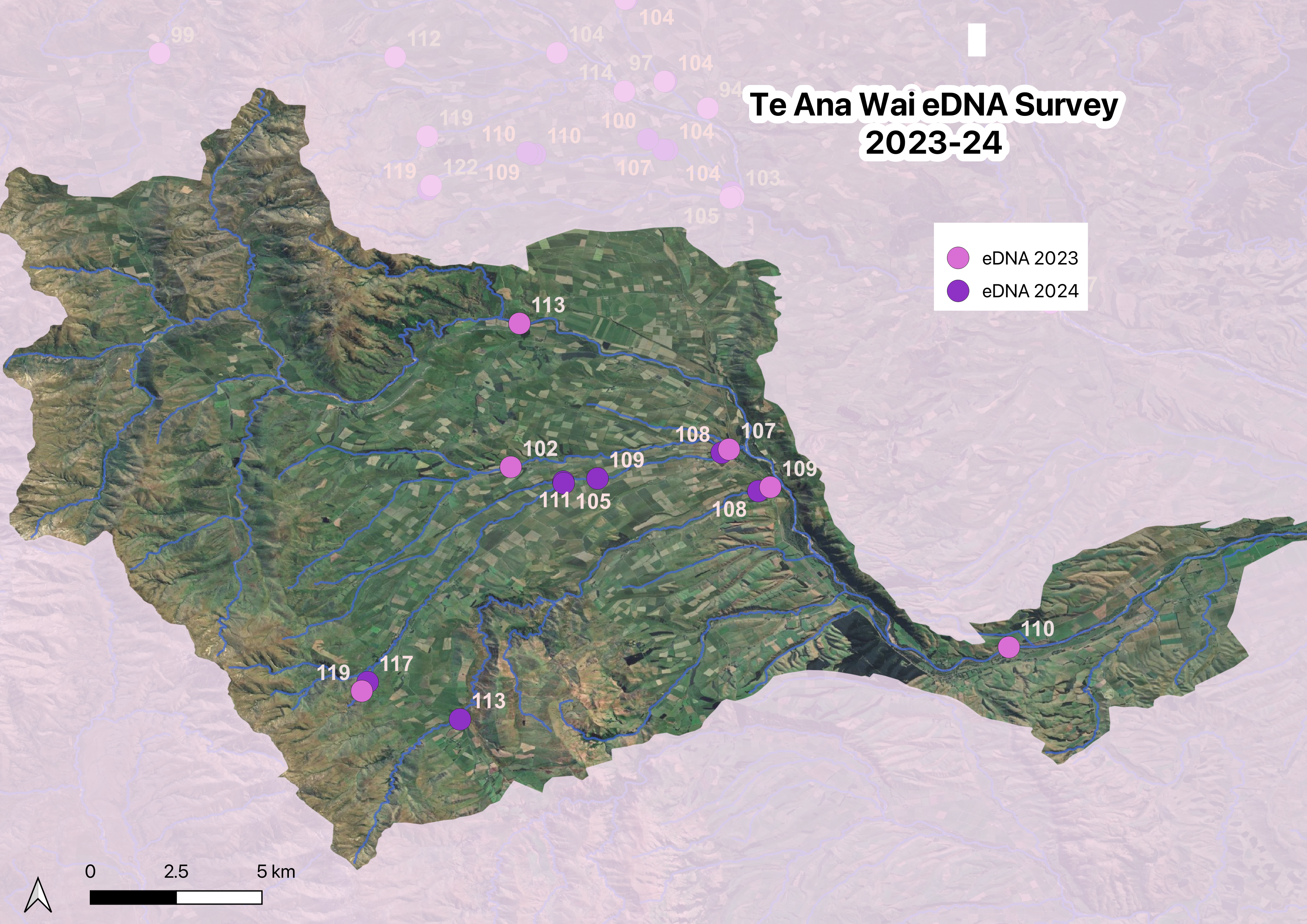 Te Ana Wai Catchment Group undertook a number of samples as part of the Living Landscapes eDNA survey. Habitat quality varied from ‘Excellent’ to ‘Good’, with variation in river flows appearing to have a significant effect. This supports and aligns with what we already know; that a shortage of water, minimal irrigation, and landscape settings which naturally removes nitrates, means the impact of what people are doing now is not the dominant control over stream health. The eDNA survey also detected highly valued fish species such as kanakna (lamprey) and chinook salmon.
